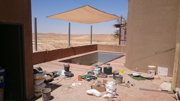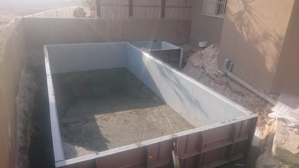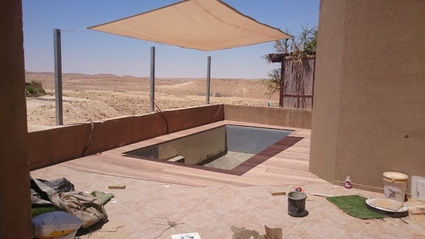 בניית בריכת שחייה מתועשת וביצוע עבודות הפיתוח, דק ומערכות חשמל ומים והתקנת מעקה זכוכית.